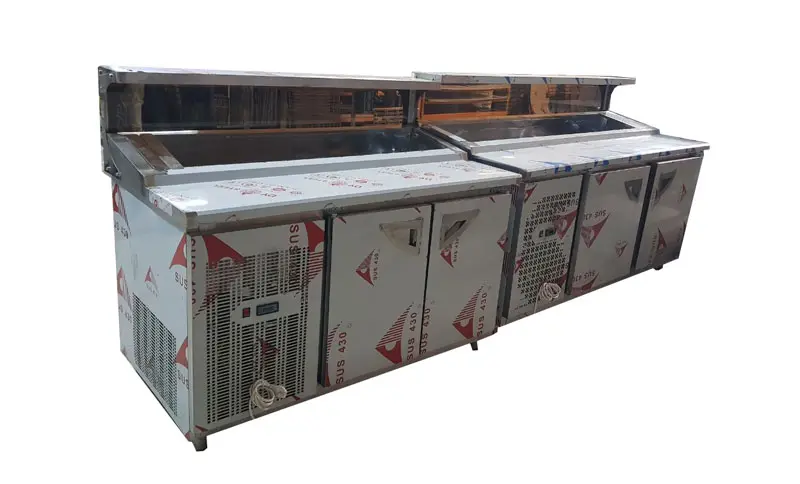 تاپینگ زیر فریزر دارای نمایشگر دمای دیجیتال و نماس استیل با کیفیت دارد. وان قرار گیری بن ماری ها در مدل زیر فریزر از استیل ۳۰۴ نگیر تعبیه شده است.این دستگاه مکمل خط تولید پیتزا در کنار سایز تجهیزات فست فود مثل : فر پیتزا ،خمیر پهن کن پیتزا و خمیر گیر میباشد.