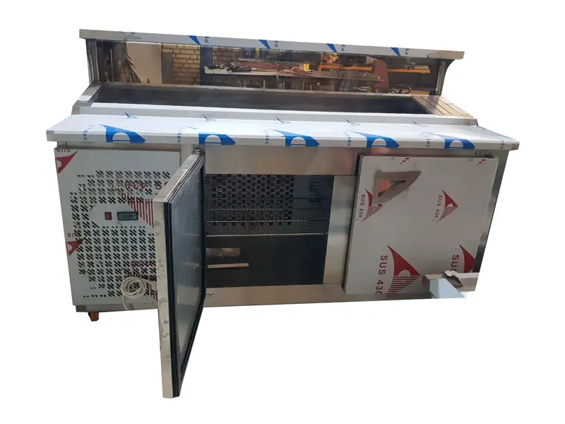 فریزر تاپینگ ۱۹۰ سانتی استیل درجه یک ، یک وسیله عالی در خط تولید پیتزا میباشد. روی کار میتوان مواد تاپینگ پیتزا مثل پنیر پیتزا،مواد روی پیتزا مثل گوجه،فلفل دلمه ای ، سوسیس و کالباس استفاده کرد. در زیر کار و قسمت انباری فریزر با سرمای منفی ۱۸ درجه تعبیه شده که مناسب برای قرار گیری گوشت و مرغ و مواد فریزری میباشد.