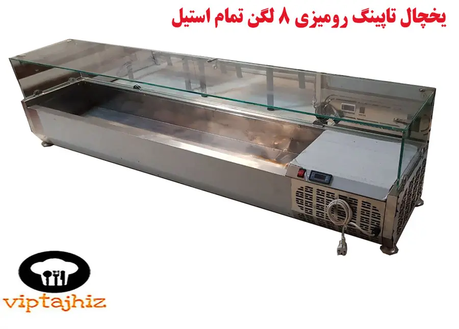 یخچال تاپینگ رومیزی 8 لگن بهترین وسیله برای تاپ و نگهداری مواد اولیه پیتزا میباشد.از این وسیله در فست فود ها و رستورانهای که فضای محدودی دارند استفاده میشود. نگهداری تازه و سرد انواع مواد پیتزا مانند : پنیر پیتزا،قارچ،سوسیس،کالباس و مواد روی پیتزا به صورت تازه میباشد.یخچال تاپینگ رومیزی دارای سه سایز ۴/۶/۸ لگن میباشد.